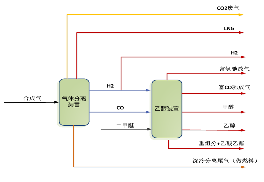 該項目主要產品乙醇、甲醇、氫氣、LNG、重組分及乙酸乙酯。項目擬采用合成氣和二甲醚為原料:外來合成氣經MDEA脫碳后,進入氣體分離裝置,氣體分離裝置采用深冷分離+PSA工藝路線生產H2、CO,同時副產LNG及深冷分離尾氣(做燃料)。外來二甲醚與CO、H2進乙醇裝置生產乙醇產品,同時副產甲醇、重組分及乙酸乙酯產品。