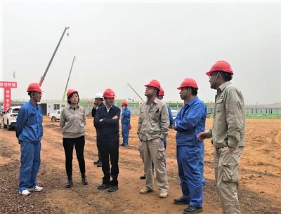 在中秋、國慶雙節前夕,北京石油化工工程有限公司黨委書記、董事長許緘濤到公司總承包的榆神能化50萬噸/年煤基乙醇項目現場慰問調研。公司董事、總經理助理鄭薇,總經理助理田平漢陪同調研。