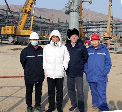 內蒙古東源科技有限公司董事長俞海明、東景生物環保科技有限公司總經理馬民峰,北油工程公司副總經理劉戈等相關領導共同見證了該項目最高設備的吊裝順利完成。