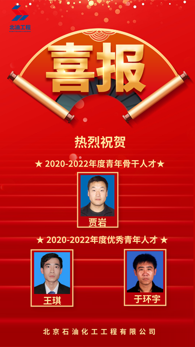 北京石油化工工程有限公司項目執行中心副主任、專業副總工程師賈巖榮獲2020-2022年度青年骨干人才榮譽稱號;電氣室于環宇、西安分公司油氣儲運室王琪榮獲2020-2022年度優秀青年人才榮譽稱號。
